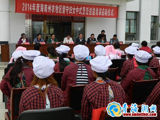 为切实提高我州偏远牧区妇女烹饪技能和家庭饮食质量,大力倡导健康饮食方式,促进家庭和谐、社会进步。根据州委安排和省妇联、省人力资源社会保障厅《关于在海南农牧区留守妇女中开展技能培训试点工作的通知》(青妇发〔2014〕24号)文件精神,州妇联、州人力资源社会保障局联合启动了“千人烹饪培训计划”。首期烹饪培训于6月19日在共和县龙羊镇龙羊新村正式开班。参加开班仪式的有州人力资源社会保障局局长纳玉福、州妇联主席赵桂莲、州人力资源社会保障局副局长东智尖参、州就业局局长宗果,青海饭店业培训学校校长宋桂兰及五县妇联主席、就业局局长、共和县龙羊镇党委书记、乡镇长,龙羊新村党支部书记、村长以及参加此次培训班的学员共 110 人。启动仪式有州人力资源社会保障局副局长东智尖参主持。这次培训主要有以下四个特点: