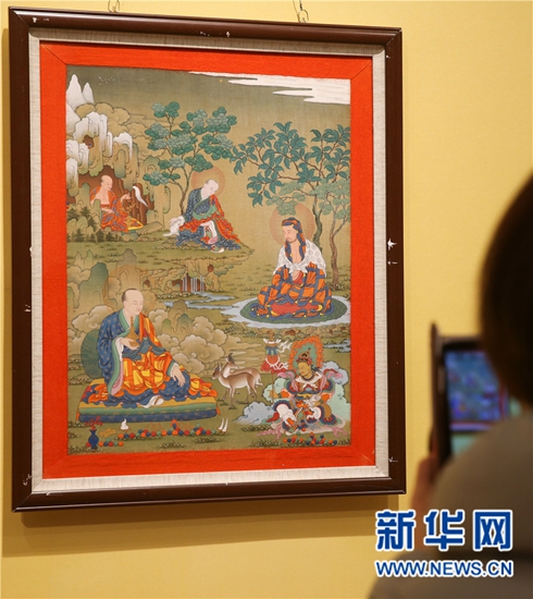2月11日,观众在拍摄展出的唐卡。当日,“三江之源——圣洁玉树康巴文化展”在上海朵云轩艺术中心开幕,展示青海玉树地区丰富多样的民间艺术和非物质文化遗产。