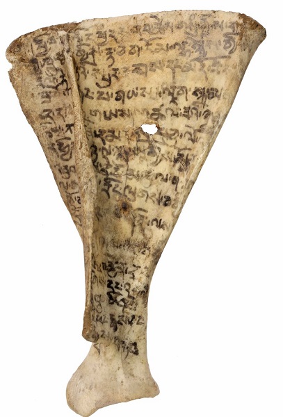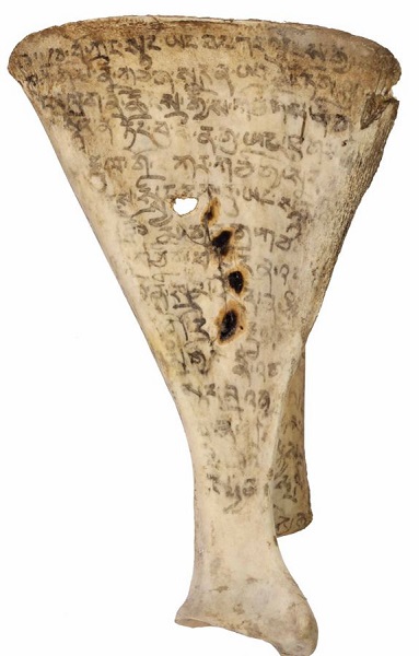 1/3 羊胛骨是藏族非常古老的传播工具和书写材料,在吐蕃时期用羊胛骨占卜吉凶的书写文本已非常成熟。在都兰热水沟北岸23号墓出土的古藏文胛骨,正面的古藏文文字是一份契约文书,可命名为《夏查那违约赔偿契约书》,背面的古藏文具有卜辞的特征,仅从字面释读,词语深奥难解,像是一份占卜结果,胛骨中央的几处炙灼烧穿的痕迹可能源于此。图为古藏文胛骨正面。
