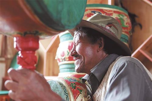 雪拉鼓传承人嘎伦在为人们展示自己精心制作好的雪拉鼓,无法表达内心的喜悦