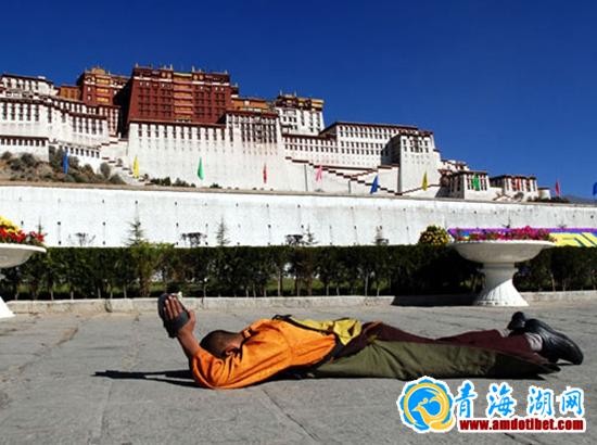 “磕长头”是藏传佛教信仰者最至诚的礼佛方式之一。佛经中说,这样顶礼一次,将获得身下所覆盖的面积直至金刚大地以上所有微尘数的转轮王位,或者得到佛陀无见顶相的功德。尤其以上师作为对境,在他面前恭敬顶礼和祈祷,《菩提道次第论讲义》、《事师五十颂讲义》中都说了,这种功德不可思议。